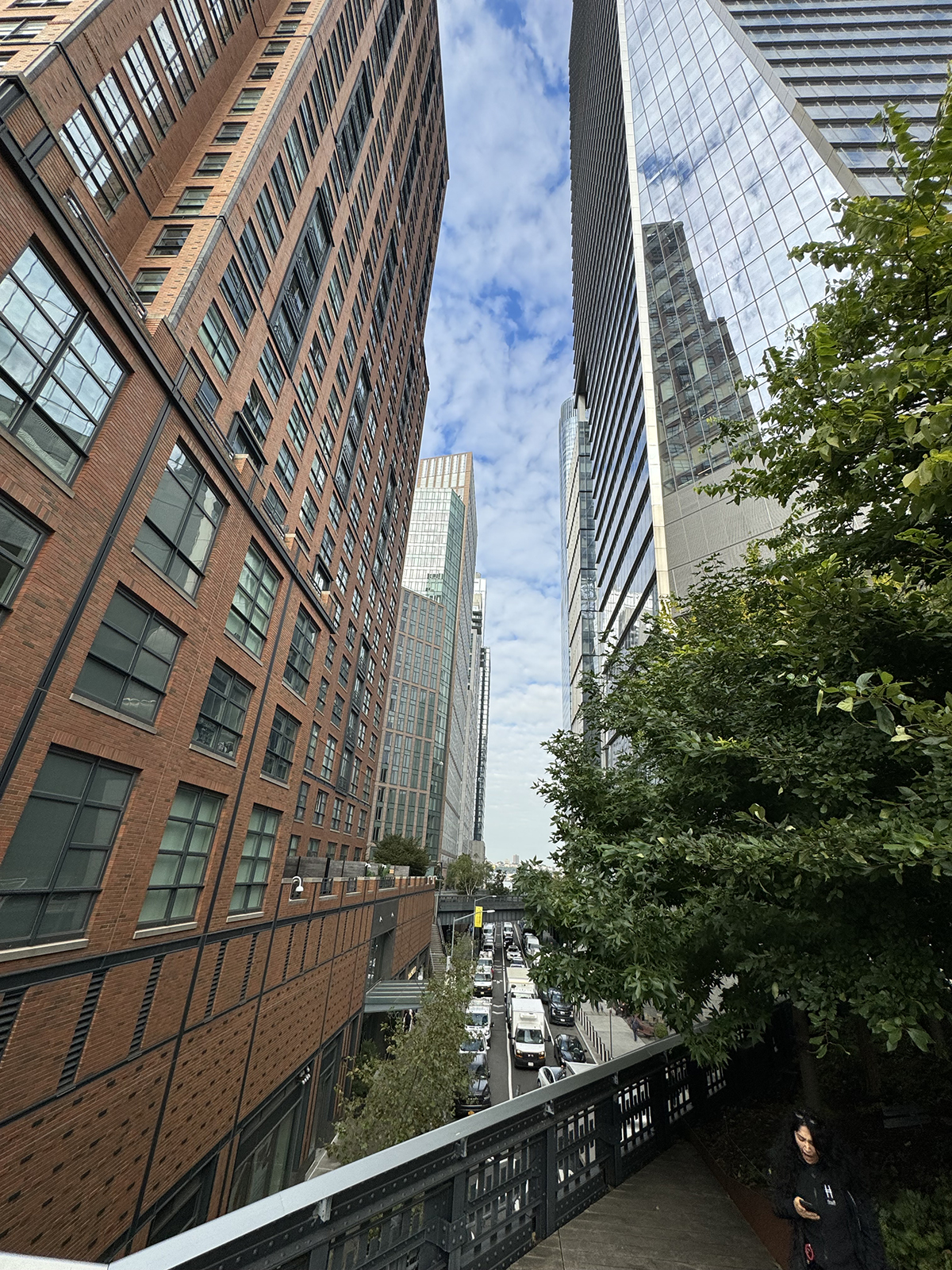 Welcome to the High Line. It’s a 1.5-mile linear park on the West Side that runs from Hudson Yards to Chelsea Market without touching a single crosswalk. It’s situated a few stories above street level on a disused railroad trestle that’s been converted to a beautiful public garden. At designated access points, stairways and elevators provide direct access between street level and the park above.