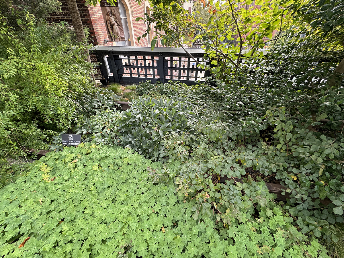 A two-block thicket in the middle of the Chelsea neighborhood forms a green tunnel of bottlebrush buckeye and Emerald Sentinel™ Eastern red cedar, with holly, rose, elderberry, sassafras, hellebore and heuchera beneath.