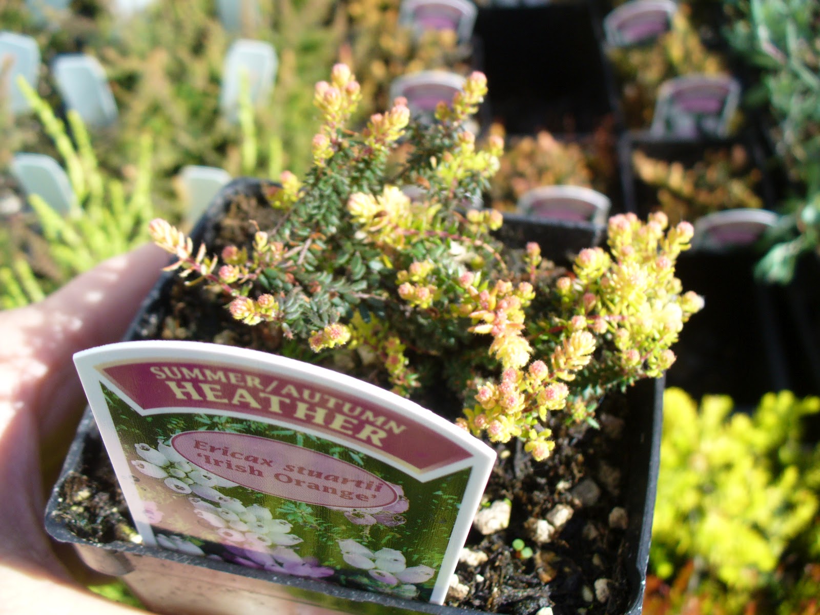 Heaths, on the other hand, include Erica and Daboecia and can bloom at different times of the year and the leaves tend to roll under at the edges. I was smitten with Erica x stuartii ‘Irish Orange’ with it’s orange and yellow new growth and Calluna vulgaris ‘Nana Compacta’ with its bun-like habit.
