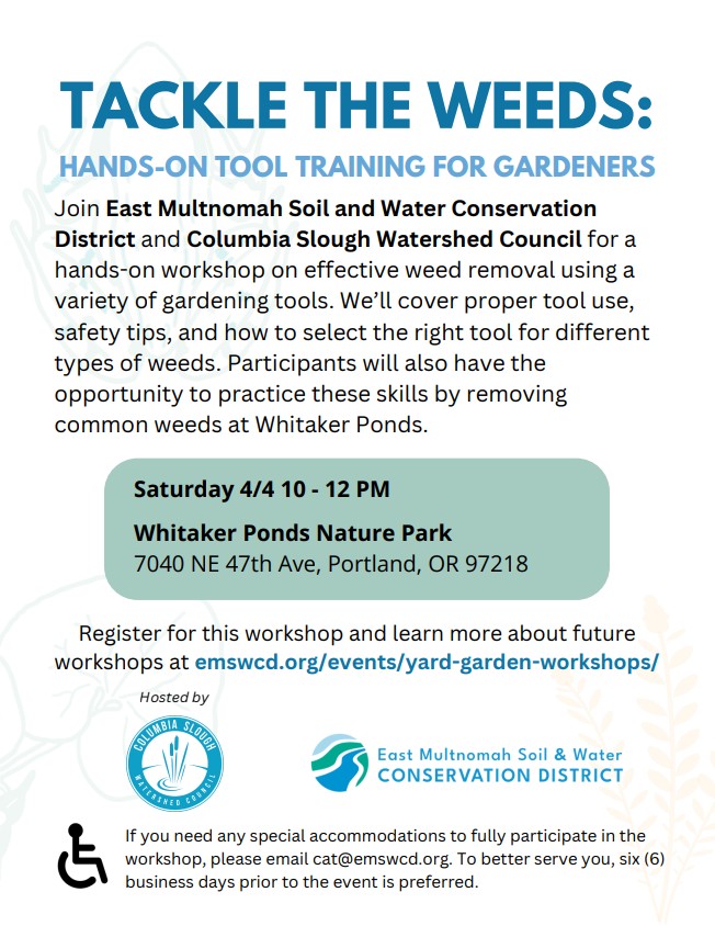 East Multnomah Soil & Water Conservation District is excited to partner with the Columbia Slough Watershed Council to present a Tackle the Weeds: Hands-On Tool Training for Gardeners workshop.