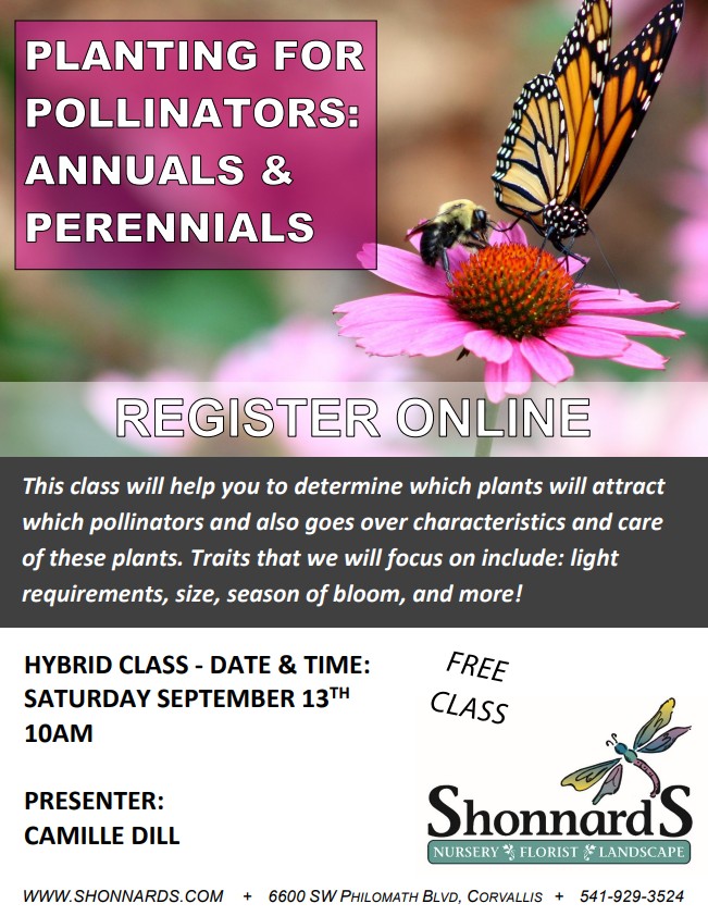 This free class will help you to determine which plants will attract which pollinators and go over characteristics and care of these plants with a focus on: light requirements, size, season of bloom, and more! Learn more and register