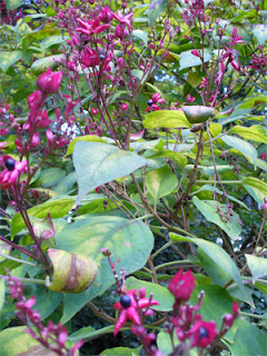 As I was walking the neighborhood, the immediately recognizable scent of Clerodendrum trichotomum (Harlequin Glorybower or Peanut Butter Tree) caught my attention. The one in my yard had already stopped blooming and was sporting its red bracts and blue fruit. I planted it because I love its fragrance, which perfumes the vicinity (my neighbor Shelley commented that she enjoys the fragrance when she sits on her deck). How do you describe the luscious scent to someone that hasn’t smelled it before?