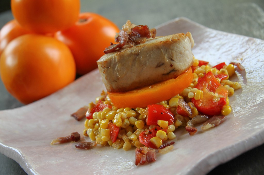 Turn the heat to high and sear albacore tenderloins in the bacon fat, letting it cook no more than 2 or 3 minutes on each side. Remove albacore to plate and drain oil from cast-iron skillet into a sauté pan. Over medium heat, add cubed bell pepper and cook a few minutes until it begins to turn limp. Add corn and stir to incorporate. Season with salt and pepper to taste and cook for 2–3 minutes, stirring occasionally. Divide the corn and bell pepper into 4 servings and mound onto each plate. Place a disc of tomato on top of the corn and bell pepper and season with a little salt and then place an albacore tenderloin on top of the tomato disc.