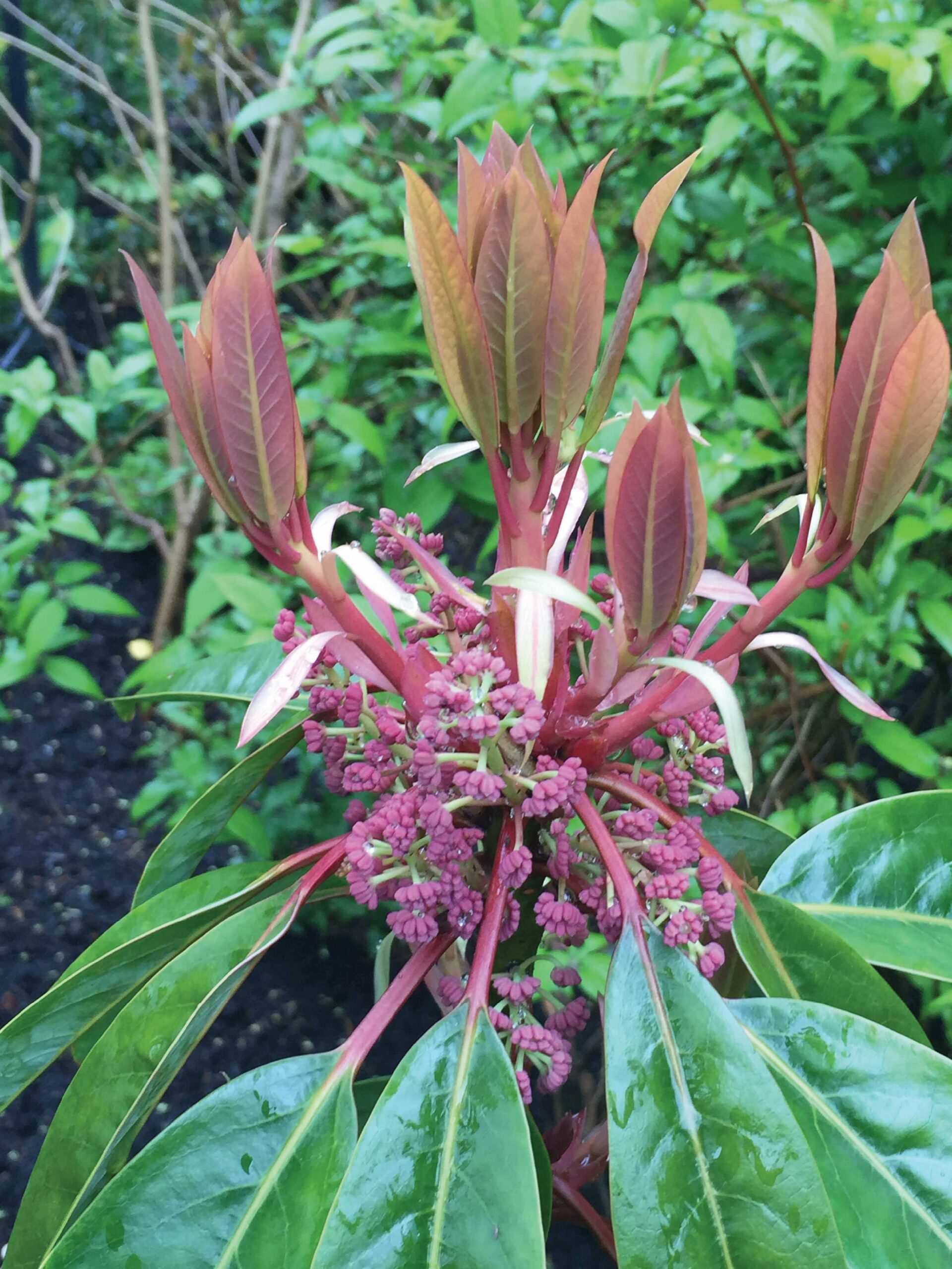 Daphniphyllum macropodim, which has no apparent common name, is a prime example of a plant with leaves that change color. This native of Japan, Korea, and China, is a large evergreen shrub or small tree that is known for the colorful new growth and rhododendron-like foliage. The plant in my garden is probably 15+ years old and has never had any disease or insect problems. Checking several botanical gardens that have Daphniphyllum, it appears that it receives some shade. While I have never had any sun burn on my plant, it does receive some natural shade from nearby trees. It is a gem of a plant that should be planted more frequently.