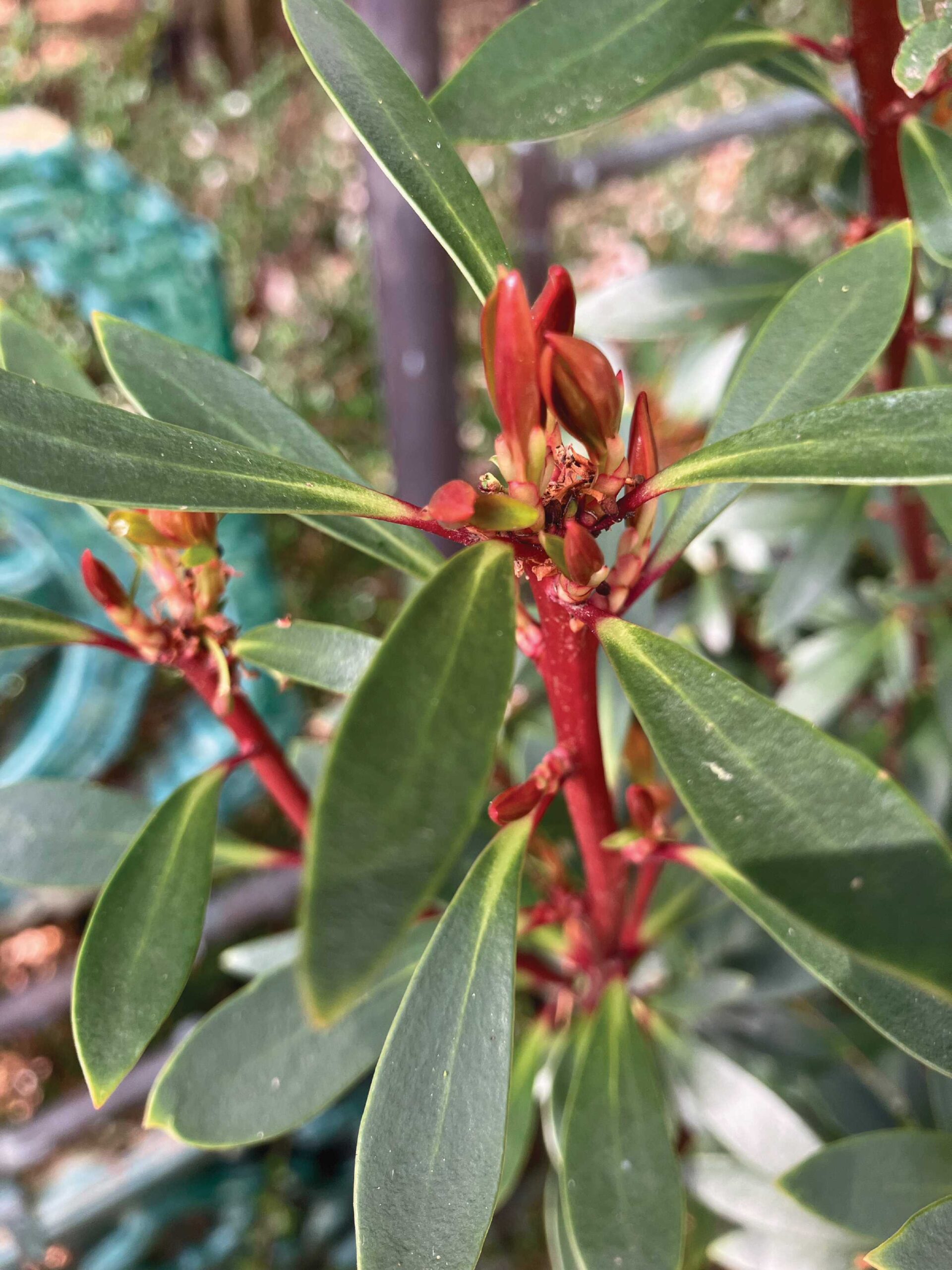 On a plant with red stems and red new growth, one would think that the mature leaves would at least have a hint of red, but that is not the case. The mature leaves on Drimys lanceolata (Tasmanian pepper bush, mountain pepper) are a solid dark green. This evergreen Australian native can make a colorful statement in the garden at any time of the year.