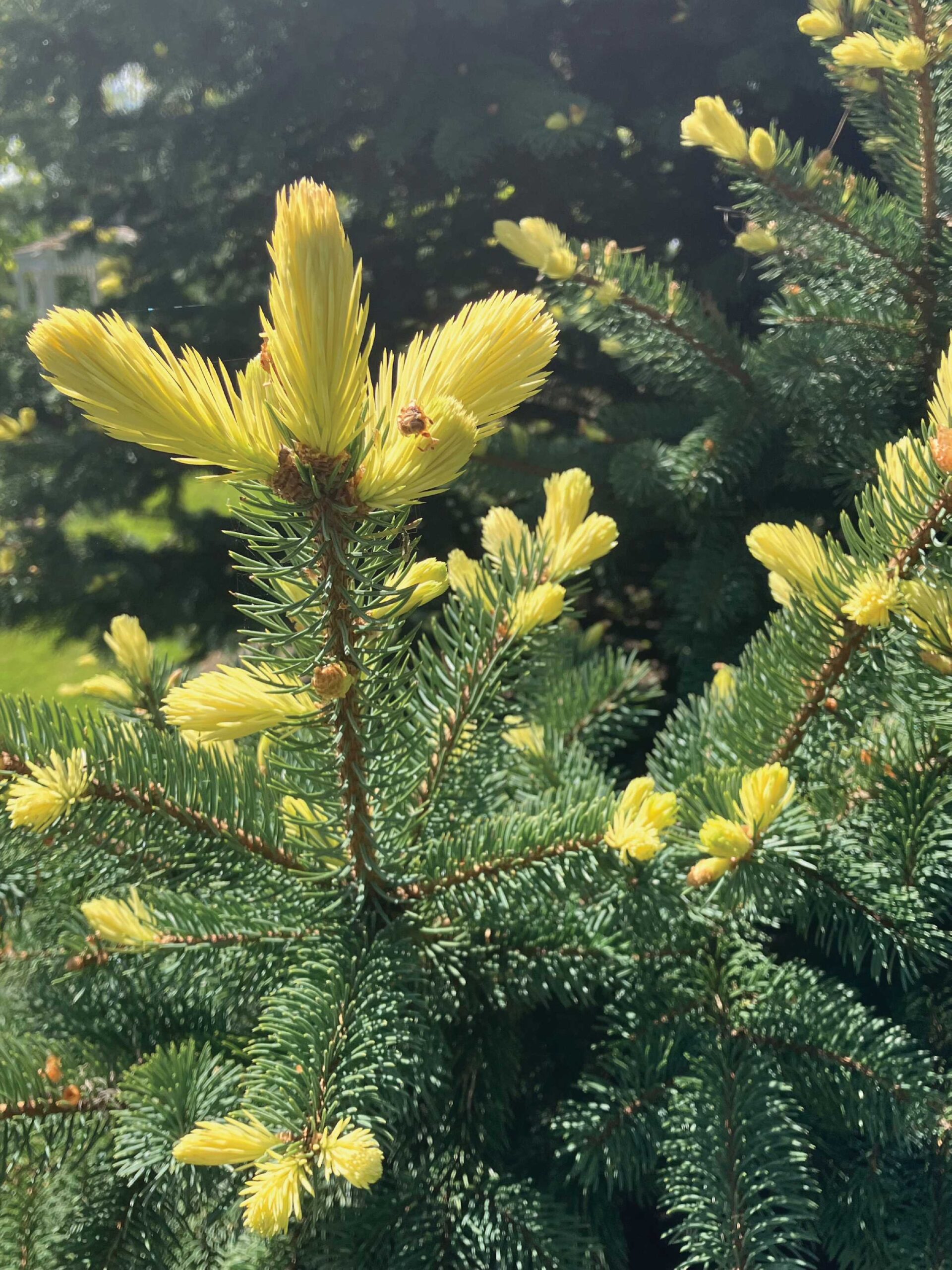 A conifer with a “wow factor” with regard to new growth is Picea pungens ‘Gebelle’s Golden Spring’. The common name made me laugh because it is like an oxymoron, yellow Colorado blue spruce. This pyramidal blue spruce was discovered as a chance seedling in a field of Picea pungens seedlings by Anthony and Anna Gebelle in Huron, Ohio.