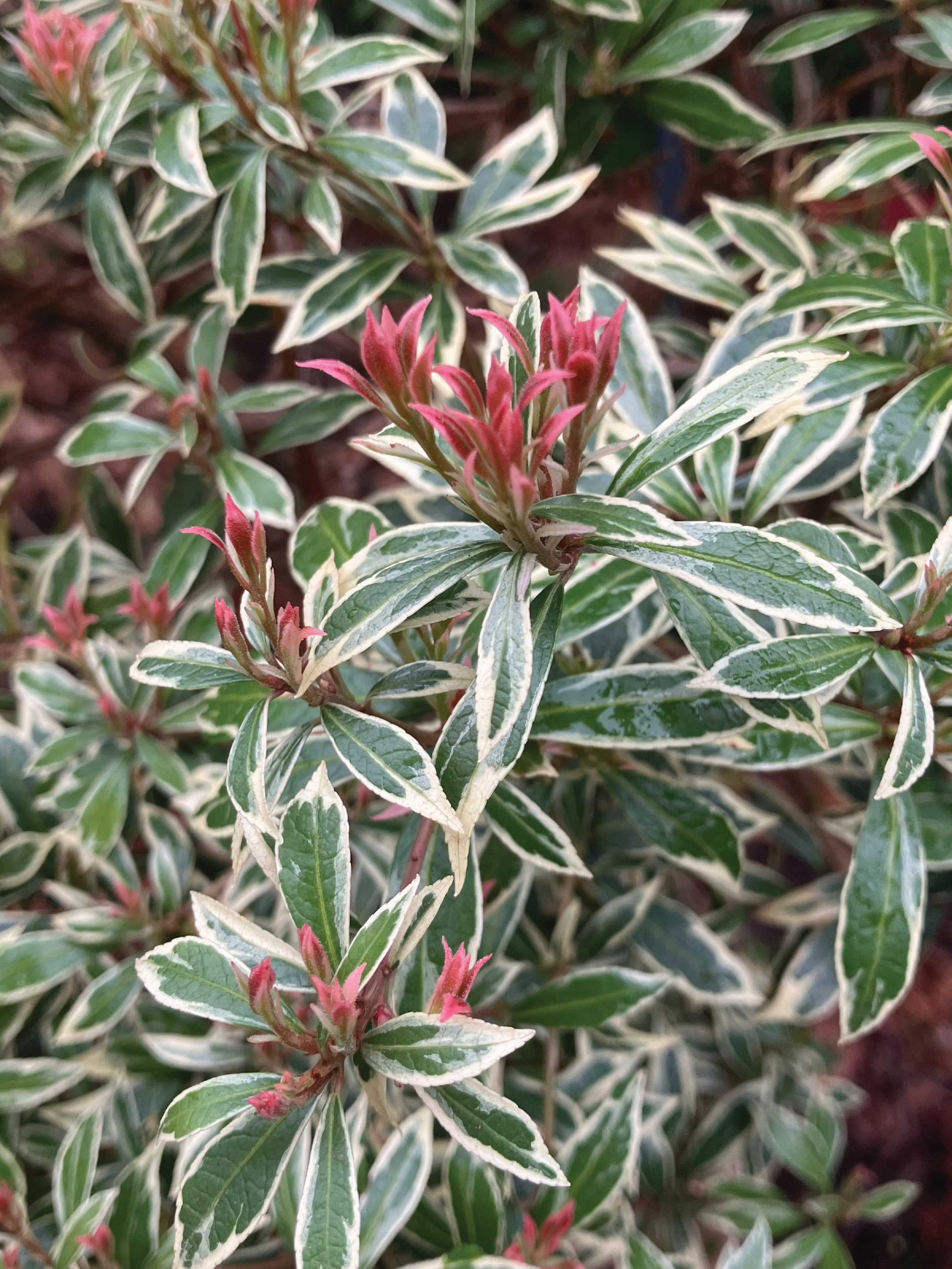 Even variegated plants can have new growth that is not variegated. Consider Pieris japonica ‘Variegata’ (lily of the valley shrub, Japanese Andromeda). The salmon-pink new growth is in sharp contrast to the mature variegated leaves. The mature green leaf is surrounded by a creamy white leaf edge that bears no hint of the new growth color from the spring.